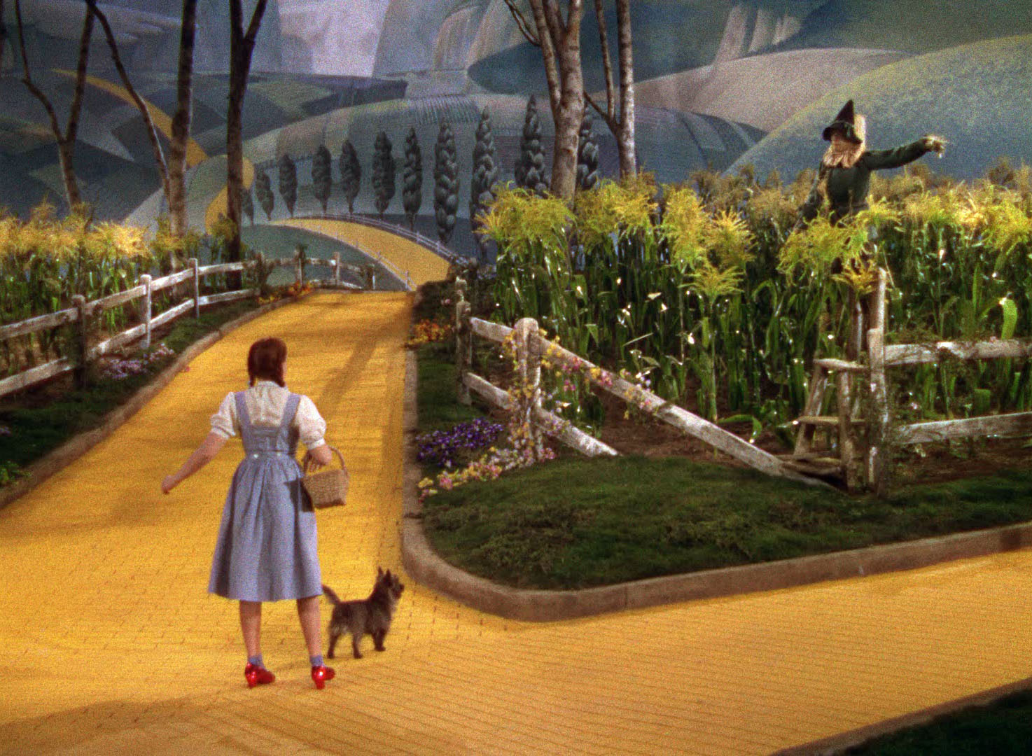 When a tornado rips through Kansas, Dorothy (Judy Garland) and her dog, Toto, are whisked away in their house to the magical land of Oz. They follow the Yellow Brick Road toward the Emerald City to meet the Wizard, and en route they meet a Scarecrow (Ray Bolger) that needs a brain, a Tin Man (Jack Haley) missing a heart, and a Cowardly Lion (Bert Lahr) who wants courage. The wizard asks the group to bring him the broom of the Wicked Witch of the West (Margaret Hamilton) to earn his help.